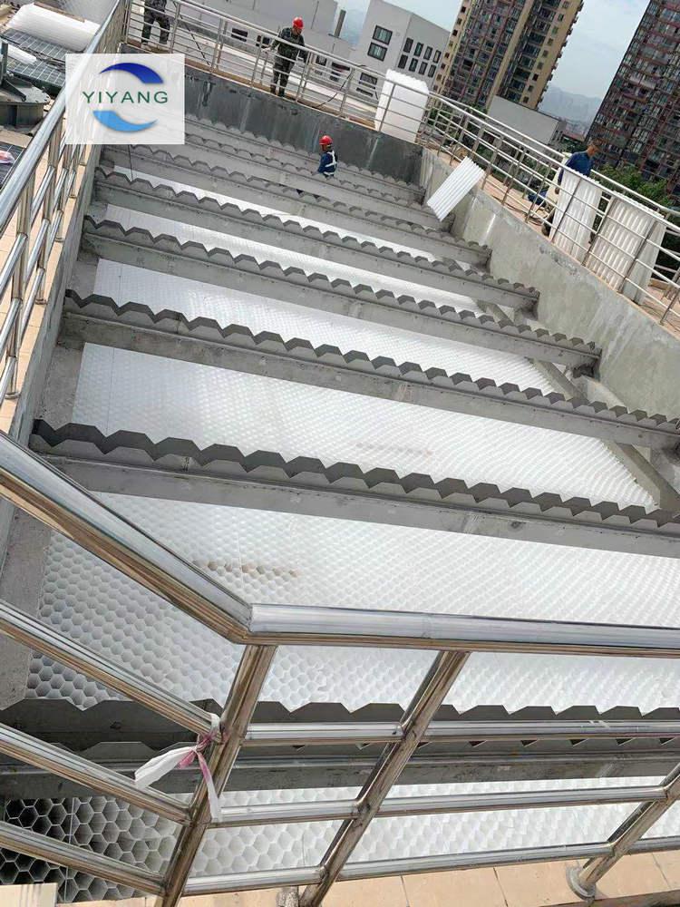 4、蜂窩斜管填料入池安裝:將所有焊接完畢的斜管填料運(yùn)到沉淀池內(nèi),開(kāi)始從陰角按順序依次排開(kāi),接觸的焊接點(diǎn)用電烙鐵繼續(xù)焊接,保證斜管填料保持60°的角度不變。按順序組裝,適當(dāng)壓緊布置排列。