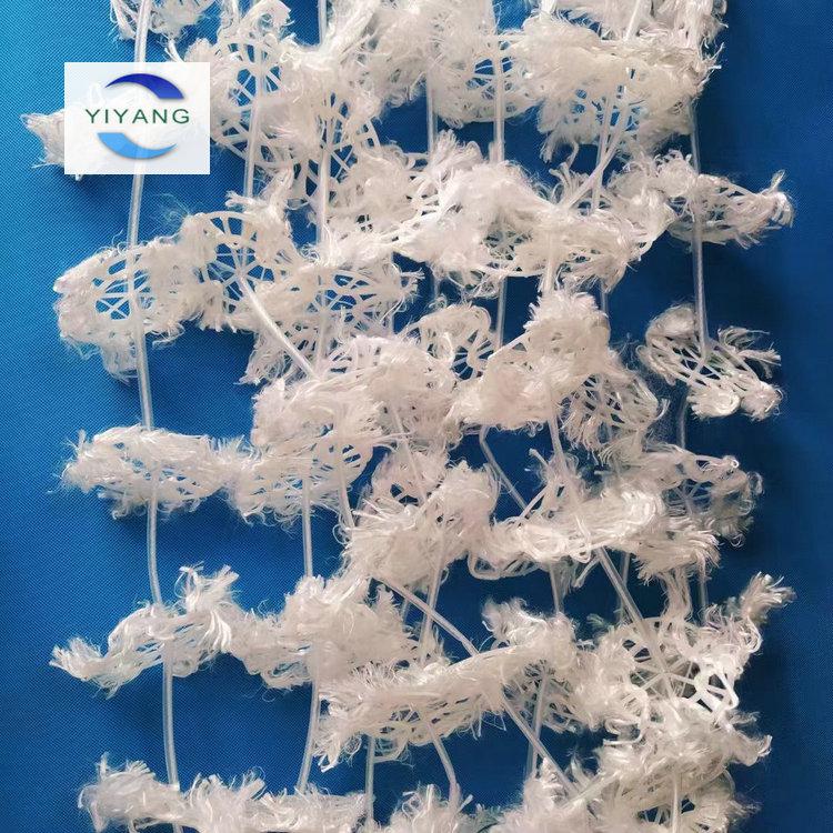 組合式填料在污水處理生化工藝池中使用較多,產品材質為全塑型夾片維綸醛化絲,它的結構是塑料環(huán)為骨架,負載維綸絲緊固在塑料環(huán)上,在污水中時維綸絲束會均勻分布散開,讓污水中的微生物附著在其比表面,雙全的大塑料環(huán)將醛化絲纖維壓在環(huán)圈上,使得纖維絲可以均勻分布,內圈是雪花狀塑料枝條,既能掛膜,又能有效切割氣泡,提高污水中氧的轉移流速和利用率,使水氣、生物膜得到充分交換,使水中的有機物得到有效處理,組合式填料在曝氣湍急的水流中依然可以穩(wěn)定工作。