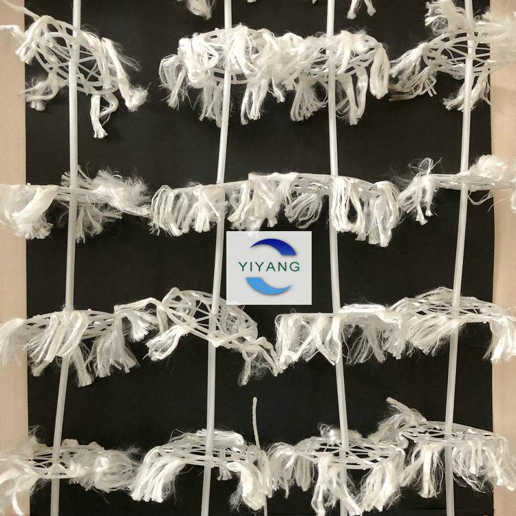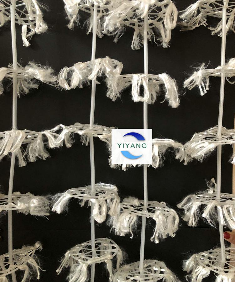 組合式填料又叫做組合式多孔環(huán)掛膜填料,產(chǎn)品由塑料環(huán)、維綸絲、中心塑料繩組成,產(chǎn)品材質(zhì)為全塑型夾片維綸醛化絲。成串狀的組合式填料每條上面有多個組合式填料片分布,有固定間距8公分、10公分。每束維綸絲串通4個方形孔,這樣醛化絲在塑料環(huán)上的牢固度就比較高了,在強(qiáng)大的曝氣湍急的水氣流的情況下,仍然能正常工作。